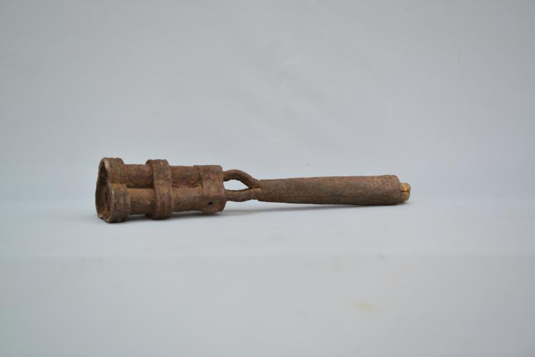 个圆孔分别与三管相通,作点火或引线用,下设带三叉的库管,内穿残存木柄。