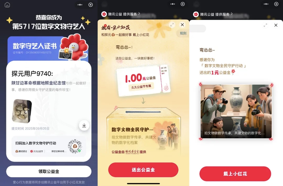 照片审核通过后,您将获得专属的 “数字守艺人” 数字证书。带上小红花,同时解锁微信 “小红花做好事” 状态!陕甘边革命根据地照金纪念馆久久公益节活动正在火热进行中,快来加入“小红花”助力团,为博物馆助力加热!
