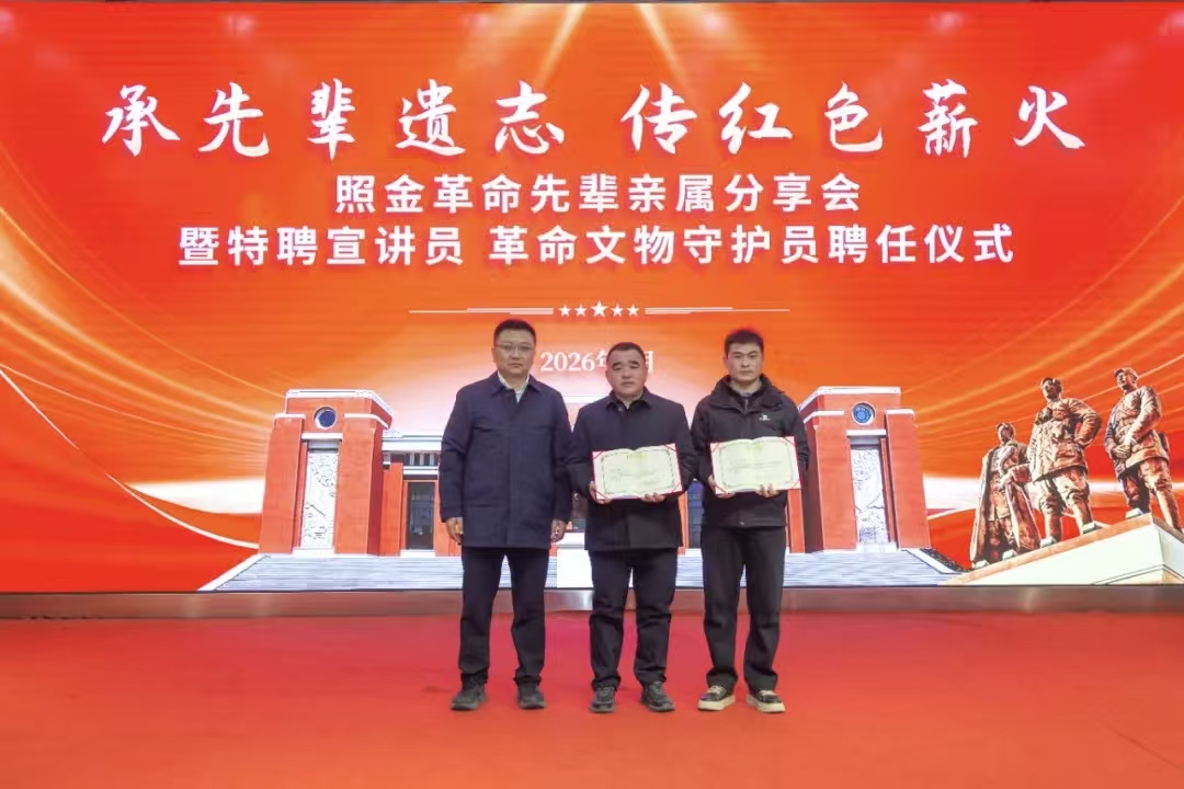 分享会上,两位革命亲属先后讲述先辈们的英勇事迹,以真挚的情感、质朴的语言,让大家真切体悟到照金革命岁月里军民同心、鱼水情深的赤诚情怀。为构建“革命亲属+专业讲解员”双轨宣讲体系,创新升级“宣讲+守护”红色传播模式,活动现场聘任余小强为照金纪念馆特聘宣讲员、王前为照金纪念馆革命文物守护员,刘亮馆长为两位同志颁发聘书。