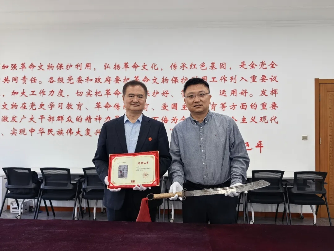 近日,照金纪念馆馆长刘亮带队赴山西吕梁征集革命文物。山西吕梁山革命博物馆馆长高宇峰及高伟伟同志向我馆无偿捐赠一把陕甘边区苏维埃政府保卫队使用过的大刀,为馆藏再添重要红色实物。