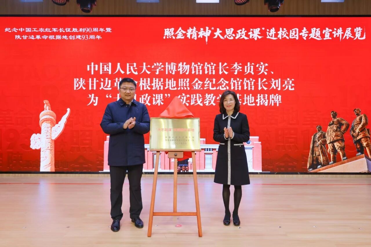 活动中,中国人民大学博物馆、校史馆馆长李贞实与陕甘边革命根据地照金纪念馆馆长刘亮共同为“大思政课”实践教学基地揭牌。基地的建立将成为红色文化传承的重要阵地、“大思政课”实践教学的优质平台,为培养担当民族复兴大任的时代新人贡献力量。