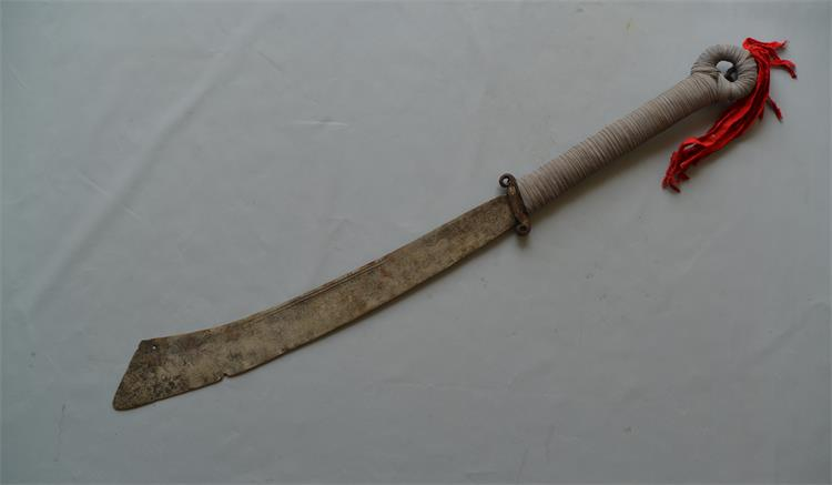 刀盘大致呈“一”字形,两端卷曲成环。刀柄较长,用棉布逐圈缠绞牢固至刀环。柄首端呈扁圆环形,系红布。