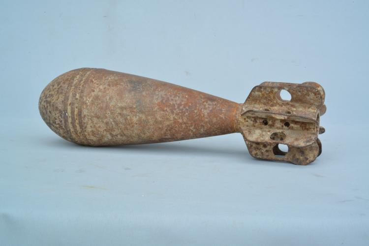 铁质铸造,表面布满红锈。弹体呈水滴状,外表面设有三条弹带,弹头部